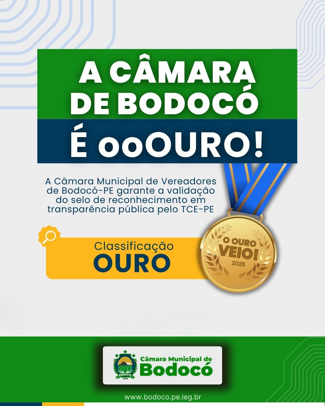 A Câmara Municipal de Bodocó foi validada com o Selo Ouro de Transparência Pública 2025, concedido pelo Tribunal de Contas de Pernambuco (TCE-PE) no âmbito do Levantamento Nacional de Transparência Pública (LNTP). Essa honraria é um reconhecimento ao compromisso da Câmara Municipal com a transparência e a responsabilidade fiscal.