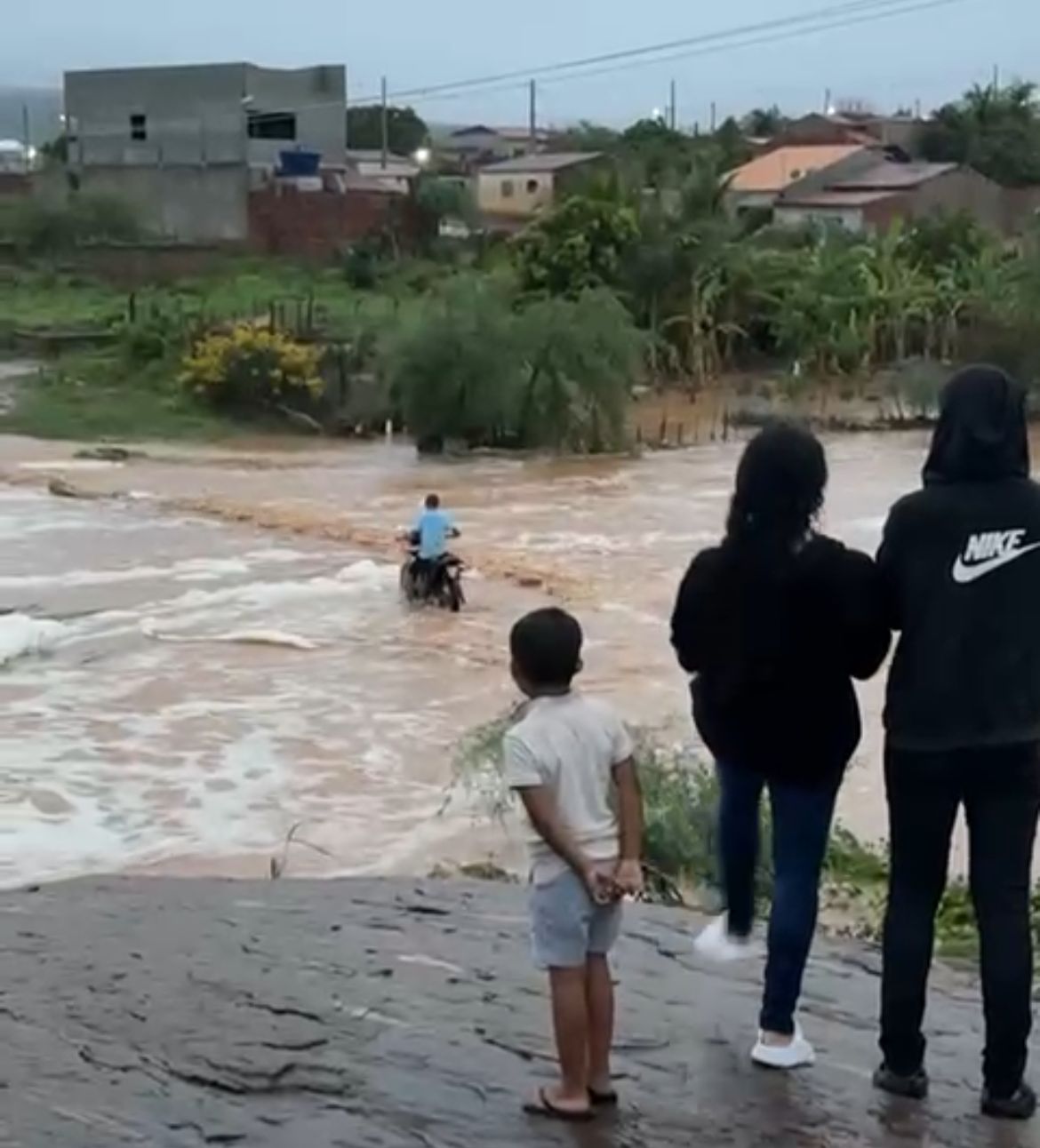 Já um motociclista que também arriscou a travessia teve a moto arrastada pela correnteza. O veículo ficou submerso, enquanto o condutor conseguiu sair com a ajuda de pessoas que acompanhavam a cena. Apesar do susto, não houve registro de feridos.