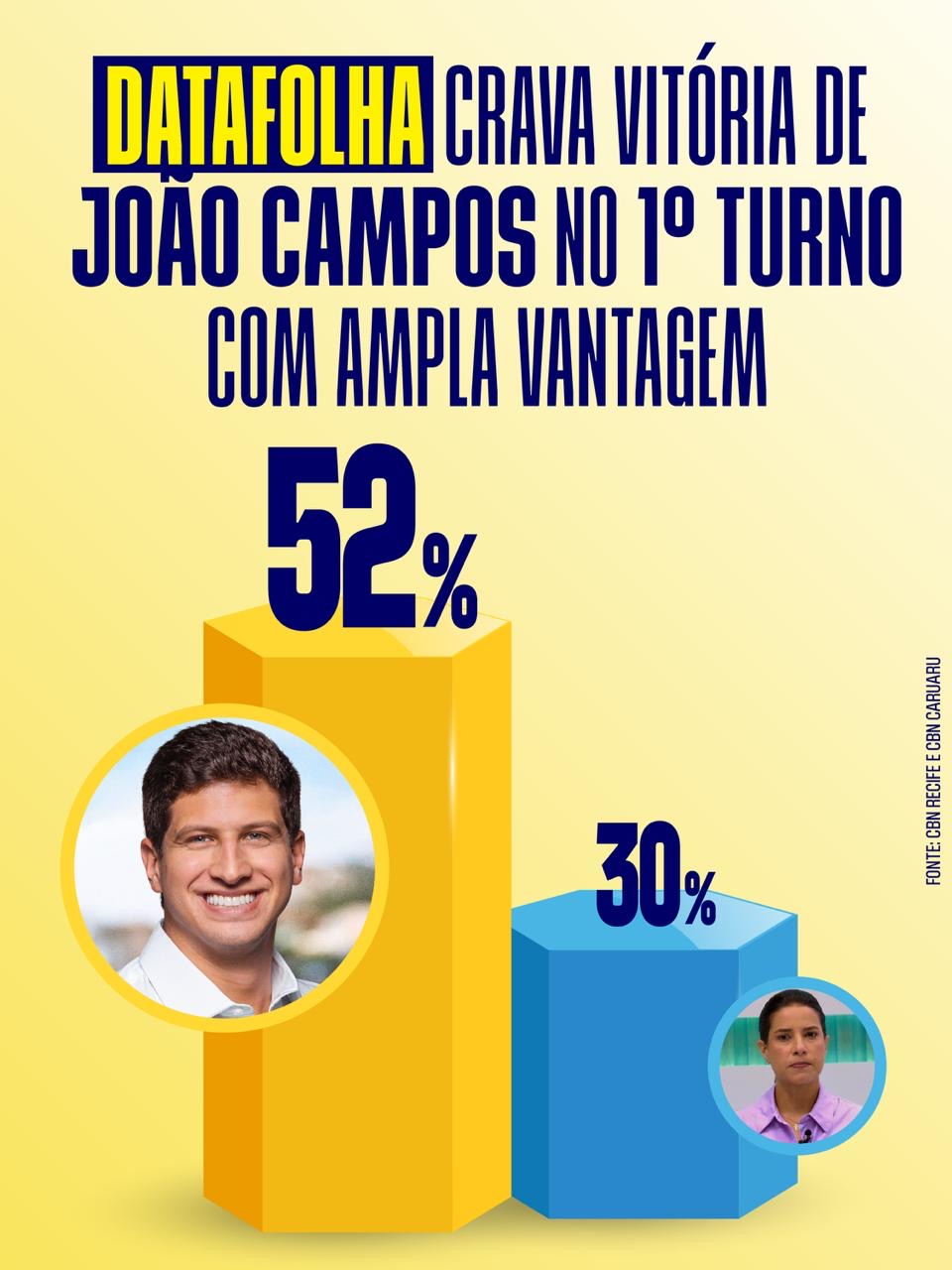 Pesquisa Datafolha divulgada nesta quarta-feira (29) mostra que João Campos (PSB) venceria, em primeiro turno, uma eventual disputa pelo Governo de Pernambuco nas eleições de 2026. O prefeito do Recife aparece isolado na liderança, com 52% das intenções de voto, contra 30% da governadora Raquel Lyra (PSD), que deve tentar a reeleição no ano que vem.