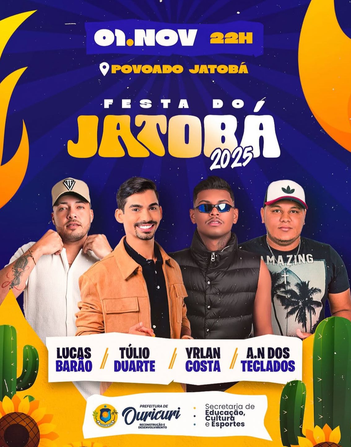 O evento, que começa às 22h, contará com as apresentações de Lucas Barão, Túlio Duarte, Yrlan Costa e A.N dos Teclados. A Festa do Povoado do Jatobá integra o plano de valorização da cultura regional promovido pela Prefeitura de Ouricuri, por meio da Coordenadoria de Cultura. A noite terá uma estrutura organizada e segura para receber o público, que promete curtir a festa até a madrugada ao som de muito forró e piseiro.