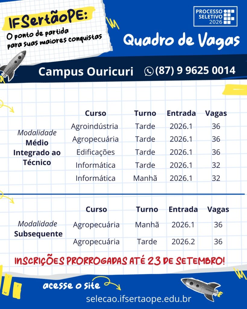 O Campus Ouricuri do IFSertãoPE informa que as inscrições para o Processo Seletivo 2026 foram prorrogadas até o dia 23 de setembro de 2025. É mais uma oportunidade de ingressar em uma instituição pública de ensino, que garante educação gratuita e de qualidade no Sertão de Pernambuco.
