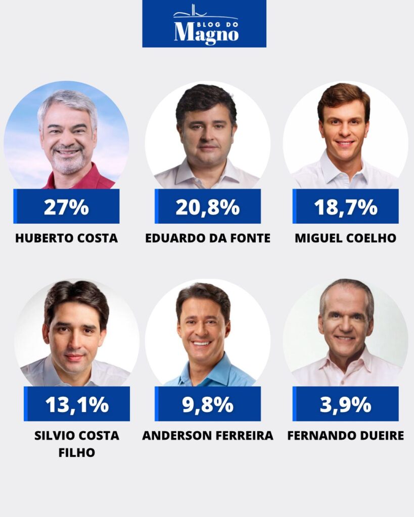 Miguel Coelho segue isolado no São Francisco (47,3%), com 20,3% no Sertão, 7,7% no Agreste, 7,6% na Metropolitana e 4% na Zona da Mata. Anderson Ferreira pontua 8,4% na Zona da Mata, 7,4% na Metropolitana, 6,2% no Agreste, 4,8% no Sertão e 4,6% no São Francisco. Sílvio Costa Filho tem 9,3% no Agreste, 8,1% na Zona da Mata, 4% na Metropolitana, 3,1% no Sertão e 0,8% no São Francisco.