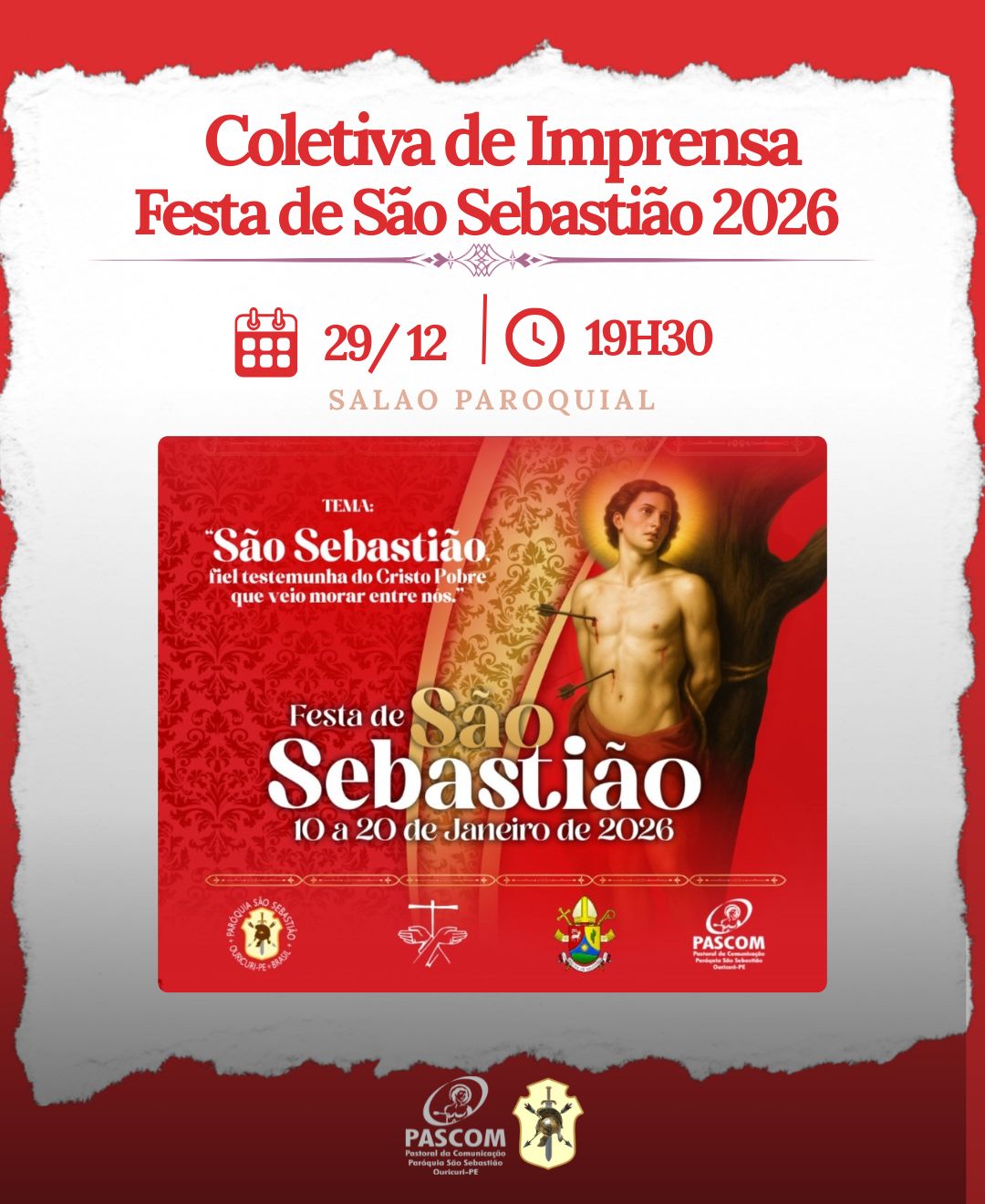A Paróquia São Sebastião, em Ouricuri, realiza no dia 29 de dezembro, às 19h30, no Salão Paroquial, uma coletiva de imprensa para apresentar oficialmente a programação da Festa de São Sebastião 2026, uma das mais tradicionais celebrações religiosas do município. O encontro vai reunir representantes da imprensa local para detalhar os momentos religiosos, a organização do evento e o tema escolhido para o próximo ano.
