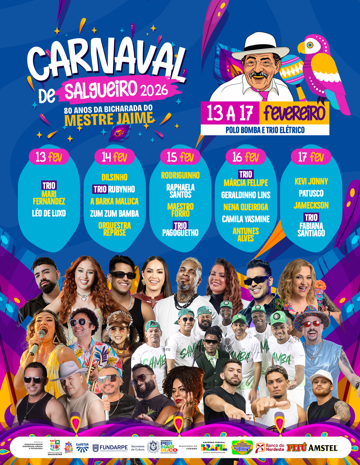A Prefeitura de Salgueiro divulgou neste domingo, 8, a programação completa do Carnaval de 2026, com tema “80 anos da Bicharada do Mestre Jaime”. O evento, que será realizado entre os dias 13 e 17 de fevereiro, teve as principais atrações reveladas pelo prefeito Fabinho Lisandro no dia 1° fevereiro, após arrastão cultural pelas principais ruas e avenidas da cidade.