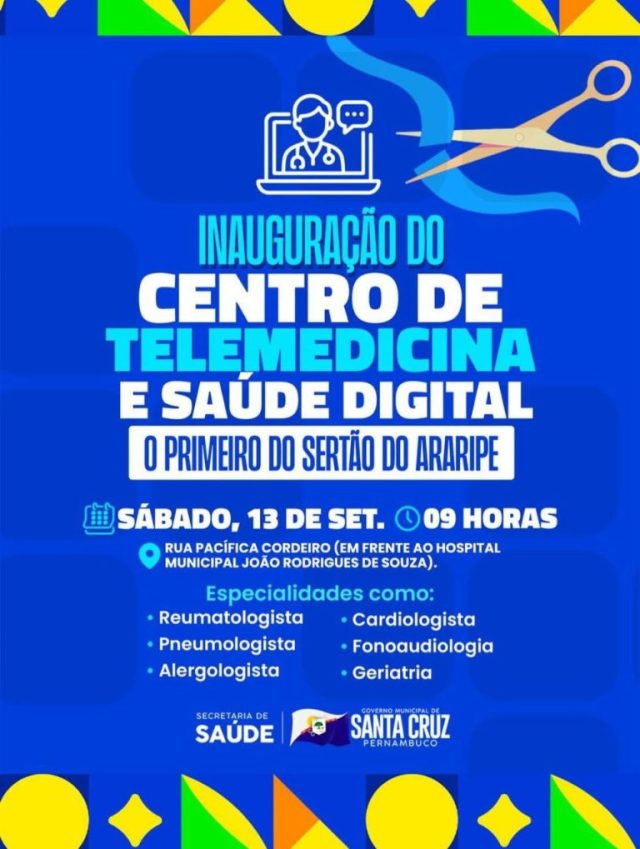 No sábado, 13 de setembro, Santa Cruz inaugura um marco para a saúde regional: o Centro Municipal de Telemedicina e Saúde Digital, pioneiro no Sertão do Araripe. O evento está marcado para as 9h, em frente ao Hospital Municipal João Rodrigues de Souza, na Rua Pacífica Cordeiro.