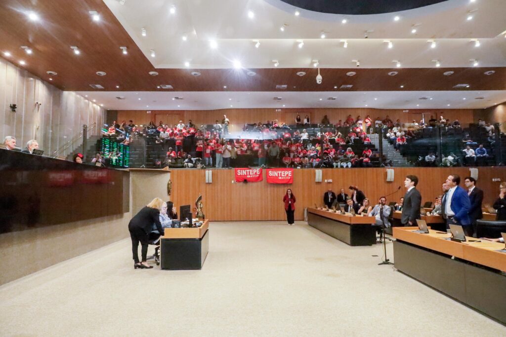 Após uma convocação de última hora, trabalhadores e trabalhadoras em educação ocuparam as galerias da Alepe e pressionaram os deputados a votar o projeto, que estava no meio de um imbróglio entre as bancadas governista e oposicionista.