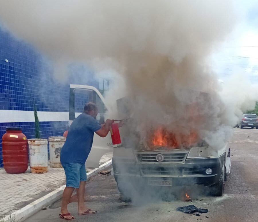 Um susto marcou o começo da tarde desta quinta-feira (26) em Ouricuri. Uma van que faz transporte de passageiros pegou fogo em frente à Câmara de Vereadores de Ouricuri. O motorista percebeu que o motor começou a esquentar e decidiu parar o veículo. Ao descer para verificar o que estava acontecendo, notou as chamas se formando na parte dianteira e tentou controlar o fogo utilizando o extintor da van.